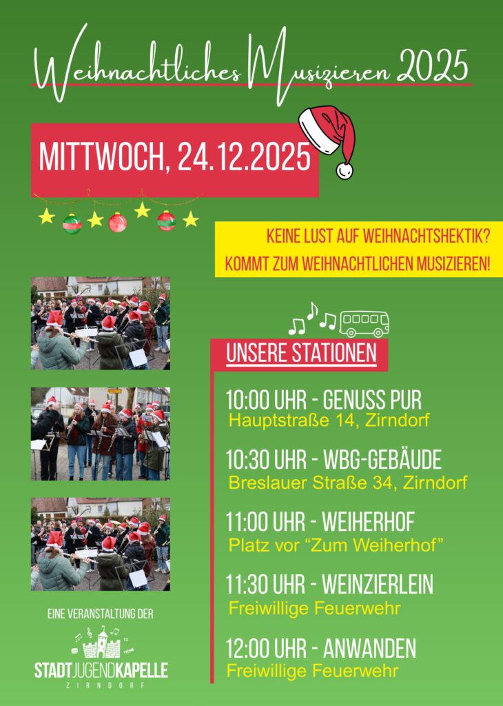 Wir kommen also wie gewohnt am 24. Dezember in die Zirndorfer Stadtteile und versorgen euch mit weihnachtlichen Klängen - Abschalten vom Stress der vergangenen Wochen und der Hektik des Weihnachtsfestes 😊🎶